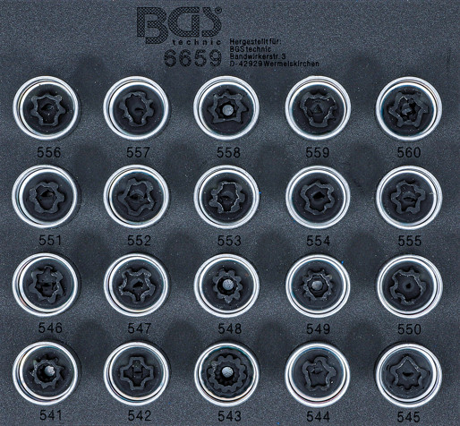 Sada 20 ks klíčů v pěnové výplni na kola VAG s bezpečnostním profilem je základem pro sejmutí šroubů a kola bez jeho poškození.