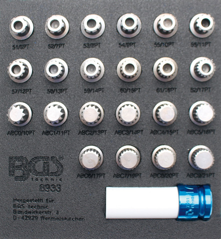Sada 23 ks klíčů v pěnové výplni na kola VAG s bezpečnostním profilem je základem pro sejmutí šroubů a kola bez jeho poškození.