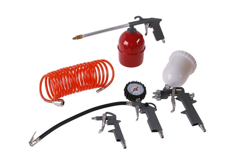 Kompresorová sada se skládá z pistole nafukovací s manometrem - pro snadné plnění stlačeným vzduchem (např.pneumatik automobilů, kol apod.), pistole stříkací s dolním a horním plněním - pro nanášení nátěrových hmot (laků, syntetických a vodou ředitelných barev) na povrchy, pistole ofukovací - pro vyfukování např. kovového prachu ze špatně přístupných míst, spirálová hadice 5m - pro připojení pneumatického nářadí ke kompresoru. Pracovní tlak 5barů - max. 8barů.