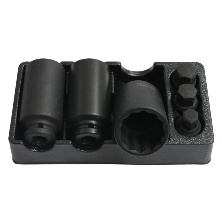 Sada nástavců na poloosy obsahuje vnitřní tisícihranné nástrčné klíče 1/2" (dvanáctihranné/dvojitý šestihranné) v dlouhém provedení o délce 85 mm ve velikostech 30, 32 a 36 mm. V sadě naleznete také krátké vnější nástrčné klíče HEX 1/2" o délce 43 mm ve velikostech H14, H17 a H19. Všechny hlavice jsou v provedení pro rázové utahováky (kované).