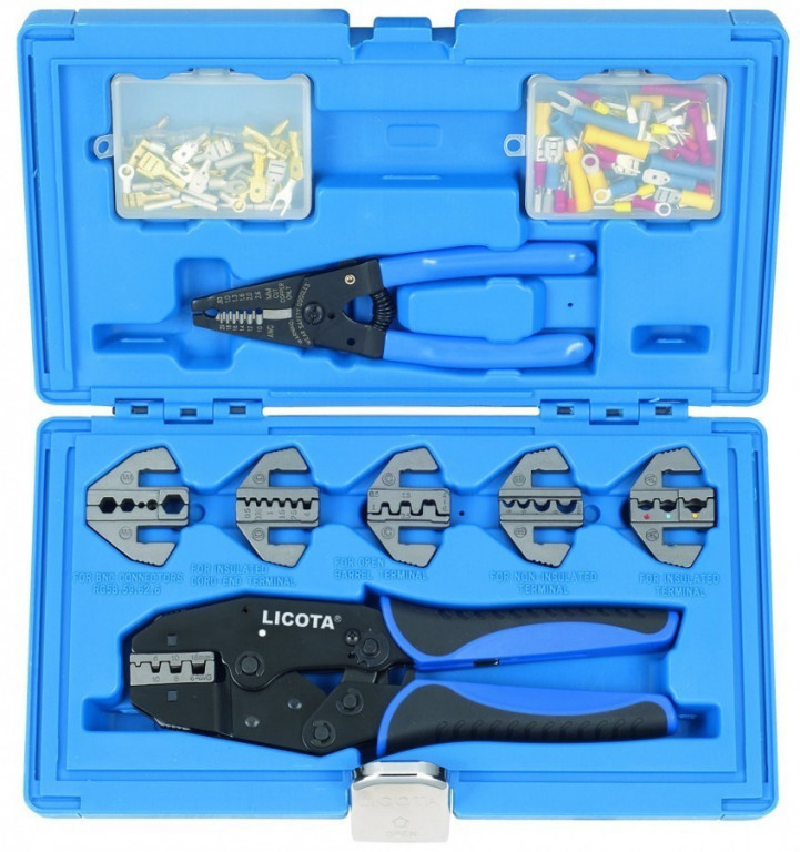 Sada profesionálních odizolovacích a krimpovacích kleští s příslušenstvím.