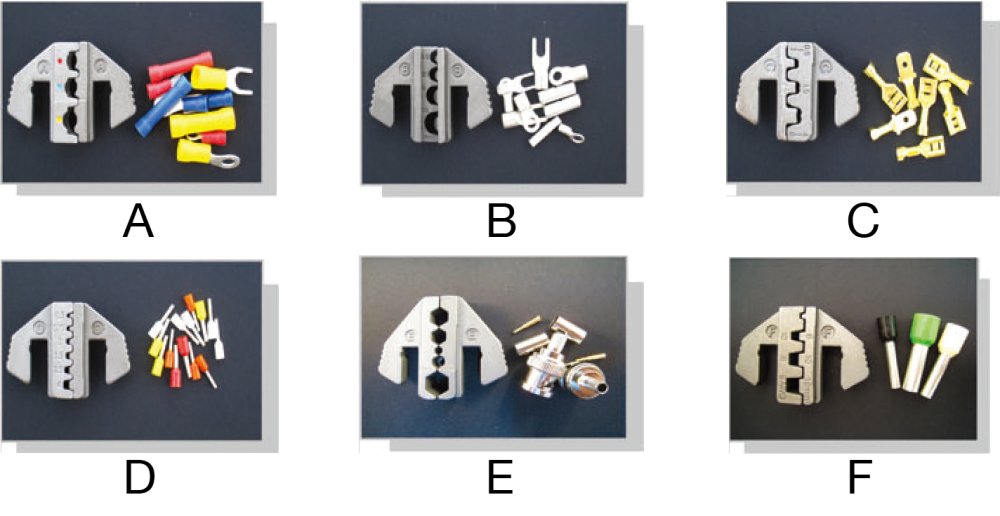 Krimpovací kleště obsahují 6 ks vyměnitelných adaptérů pro různé druhy koncovek (viz. foto).