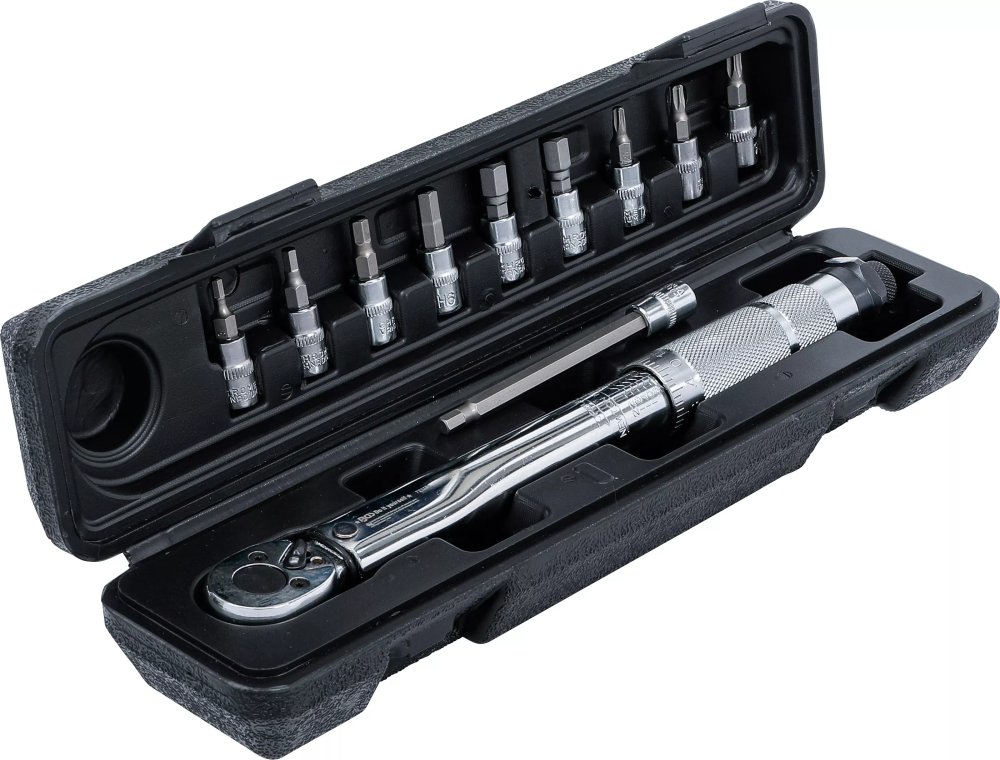 Kompaktní 11dílná sada momentového klíče 1/4" je určena pro přesné montážní práce na jízdních a horských kolech.