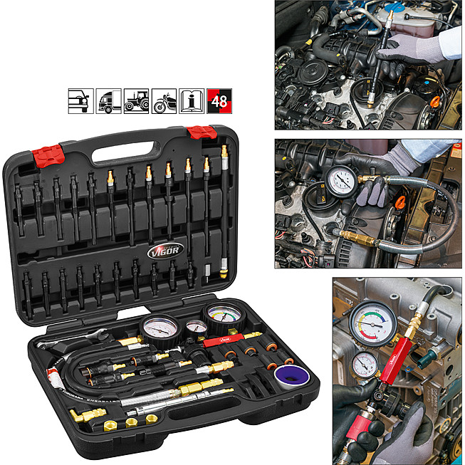 - Pro profesionální zkoušení komprese nebo tlakové ztráty pro většinu motorů osobních vozů, nákladních vozů, autobusů, zemědělských vozidel, lodí, motorů Hdi, TDCi a motorů čerpadlo-tryska.