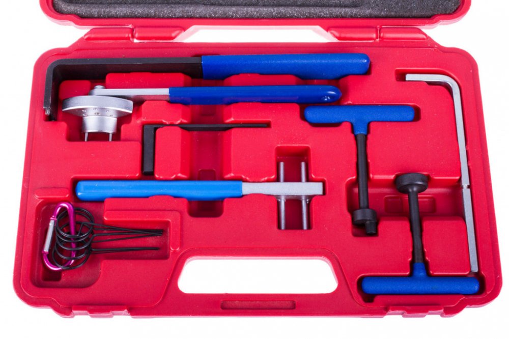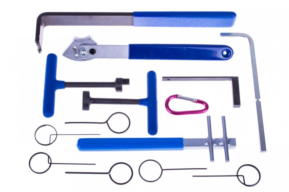 Komplexní sada napínáků a klíčů požadovaných k výměně rozvodových řemenů u většiny běžných benzínových a dieslových motorů.