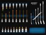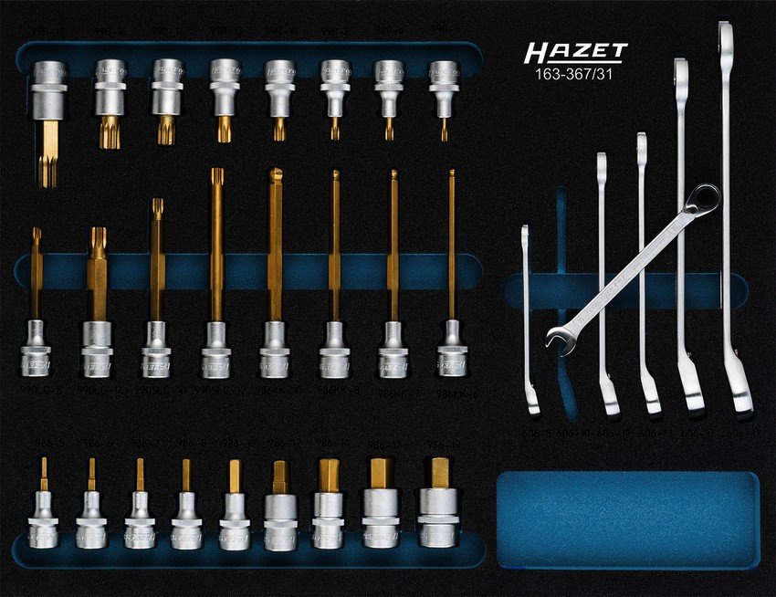 Sada nářadí, kvalitní německý výrobce HAZET, celkem 31 kusů v pěnové vložce do dílenských vozíků, obsahuje hlavice 1/2" s bity a očkoploché ráčnové klíče. Celý popis