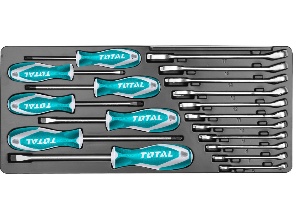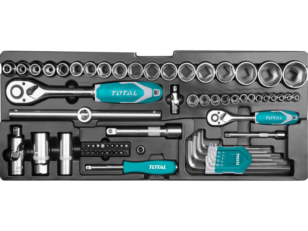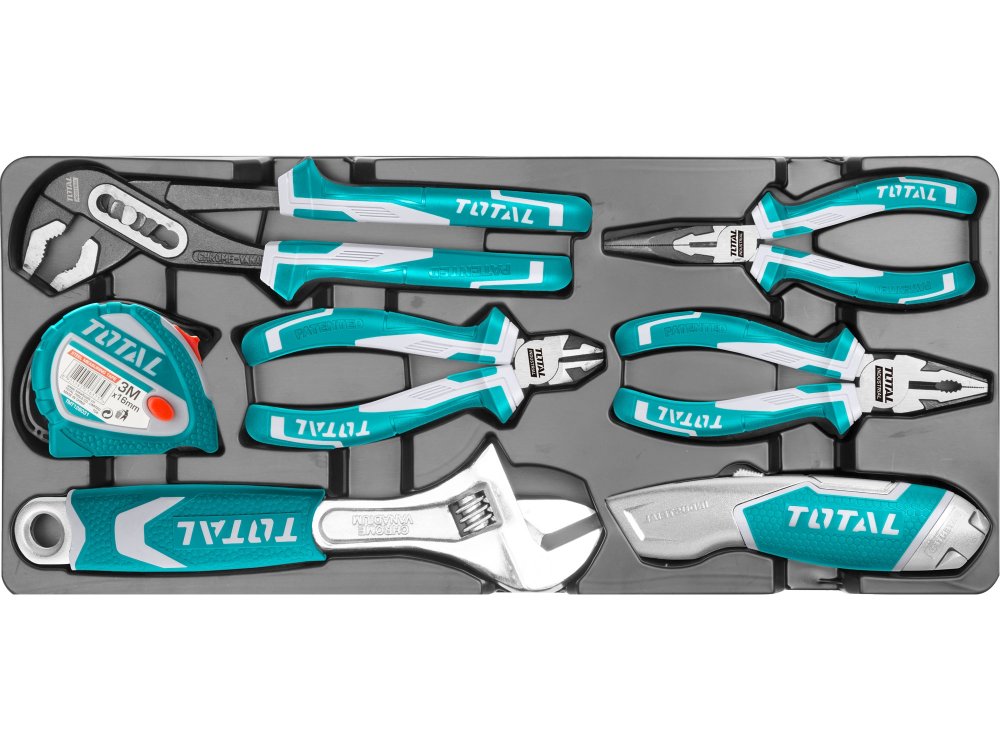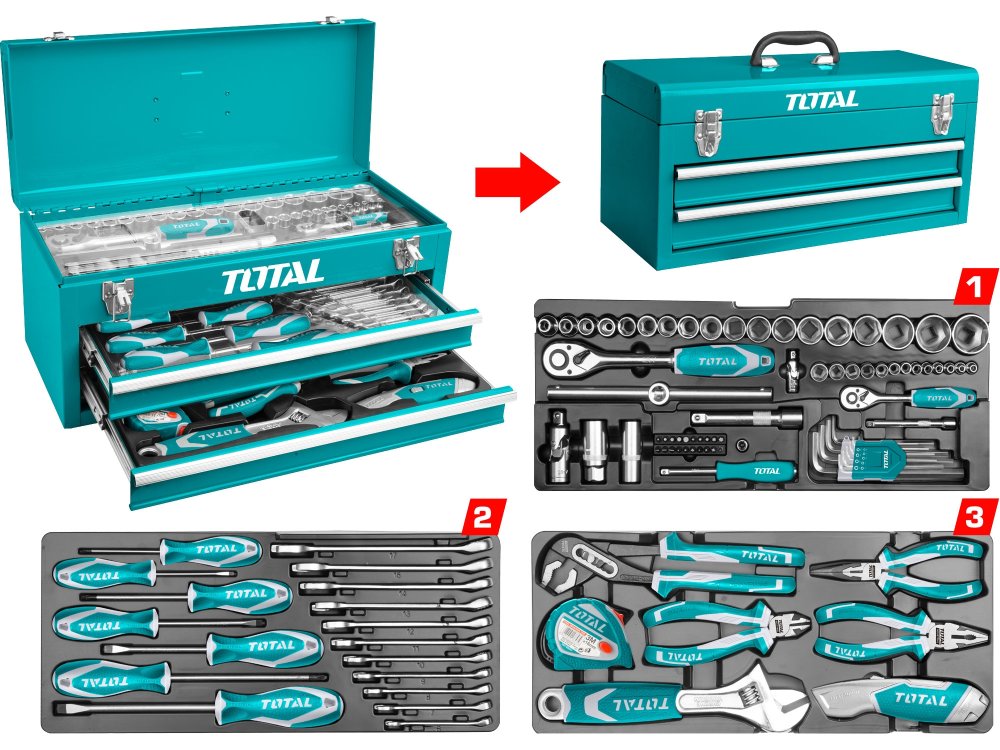 Profesionální sada nářadí značky TOTAL. Vše, co potřebujete pro práci v dílně, nebo jako řemeslník pro nejrůznější podnikatelské aktivity. Industriální kvalita a uzamykatelný ocelový box se dvěma šuplíky.