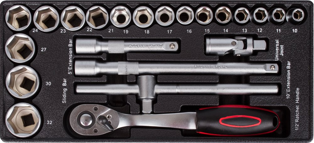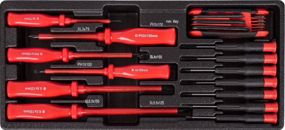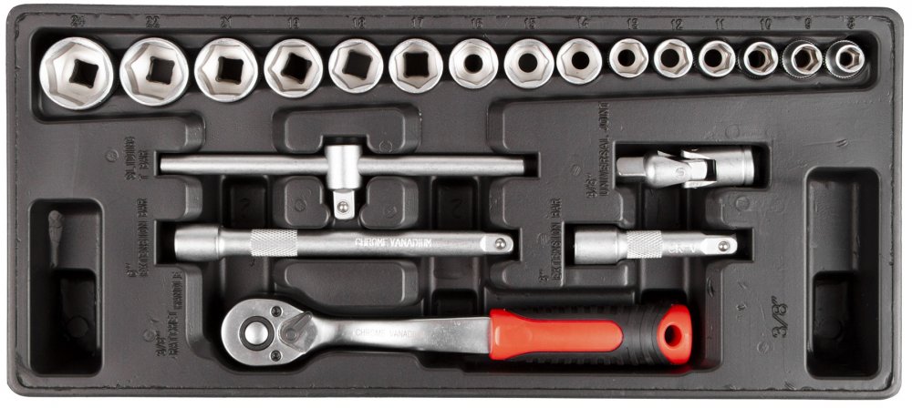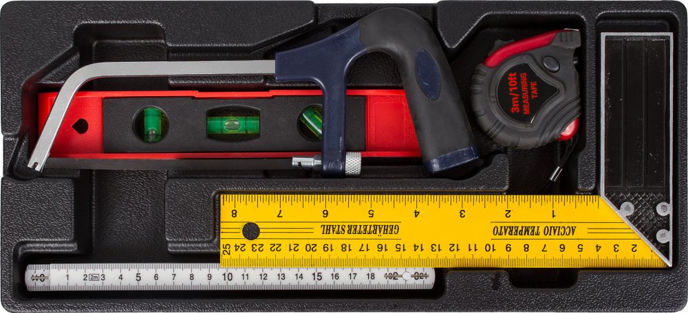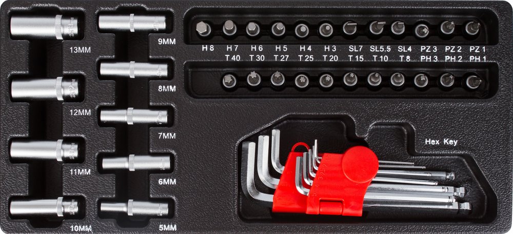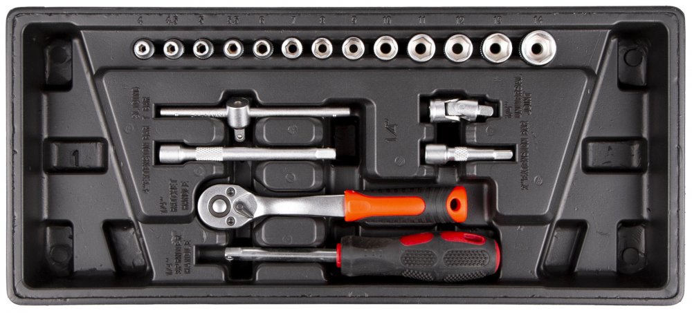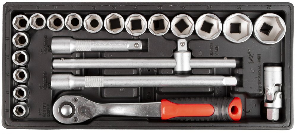 V sadách nářadí naleznete gola sadu 1/4", 3/8" i 1/2", nástrčné klíče, kleště, kladivo a paličku, šroubováky (klasické, elektrikářské i hodinářské), IMBUSy, očkoploché klíče, měřidla a např. rašple a pilníky.