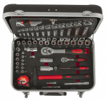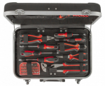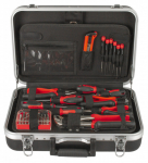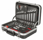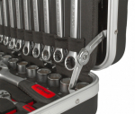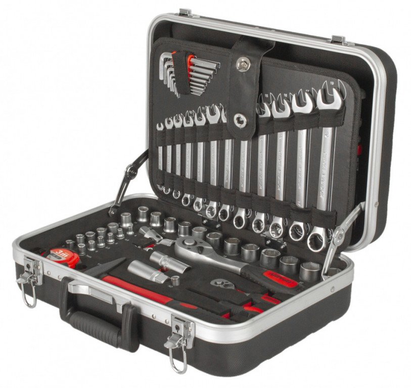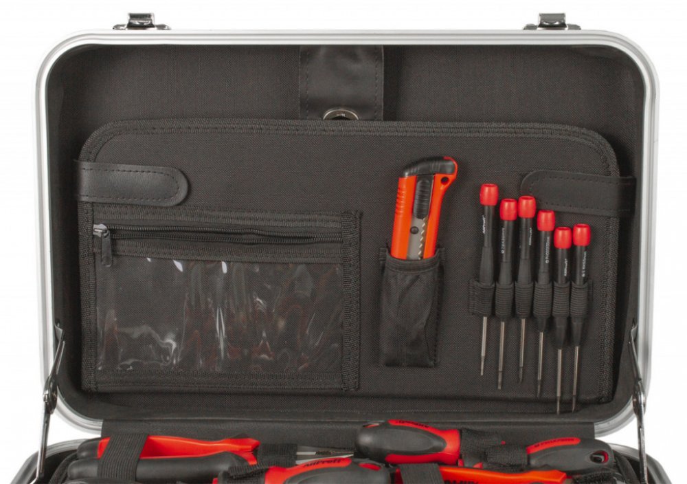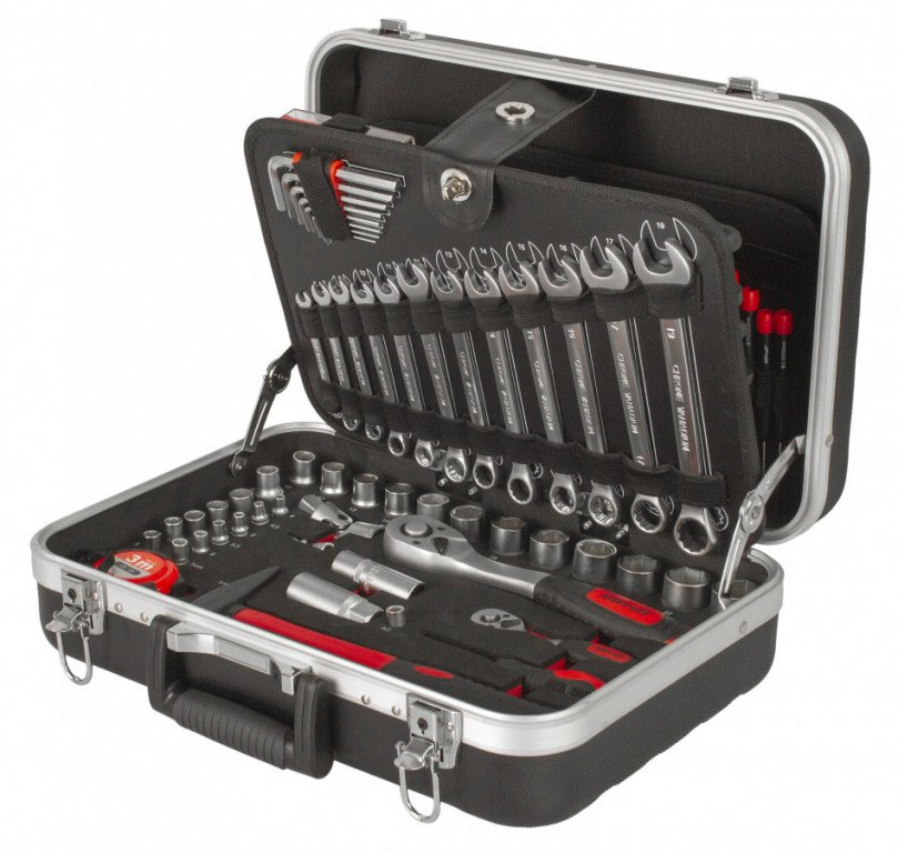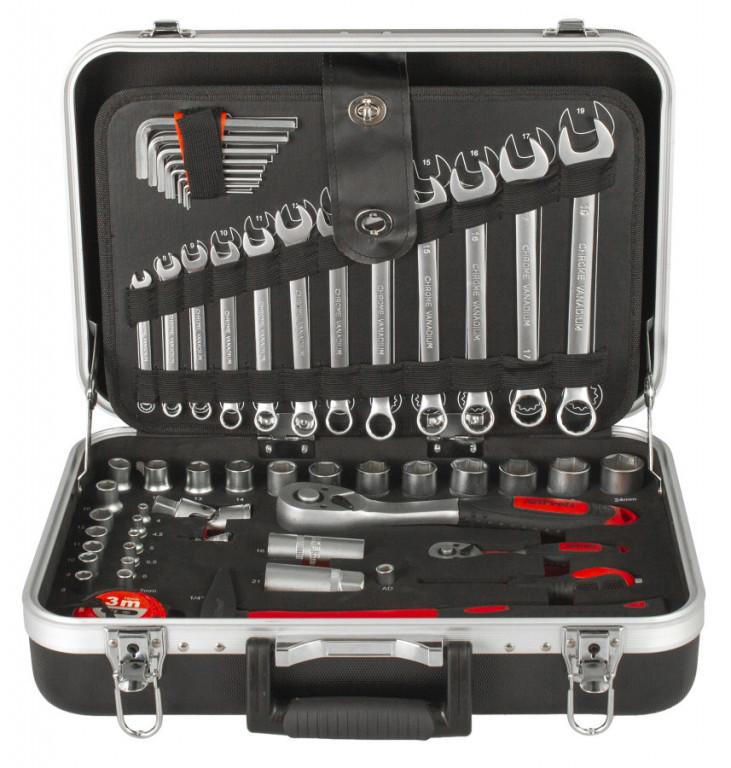 Uvnitř kufru se nachází několik sad profesionálního nářadí. Nářadí je vyrobeno ze slitiny Cr-V a jeho ergonomické rukojeti jsou příjemně pogumované, takže nekloužou, padnou do každé ruky a zajistí pohodlný úchop.