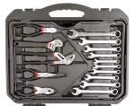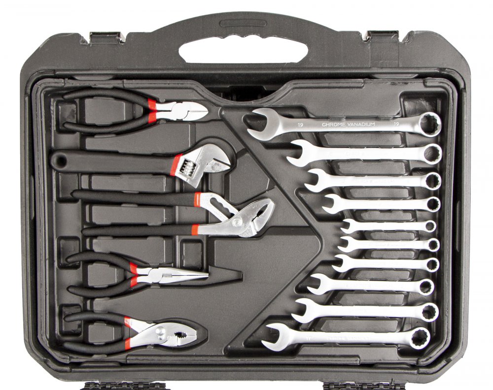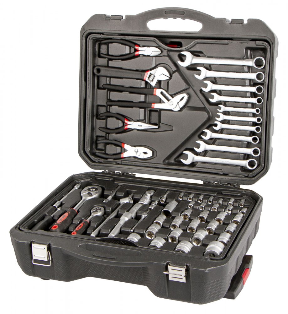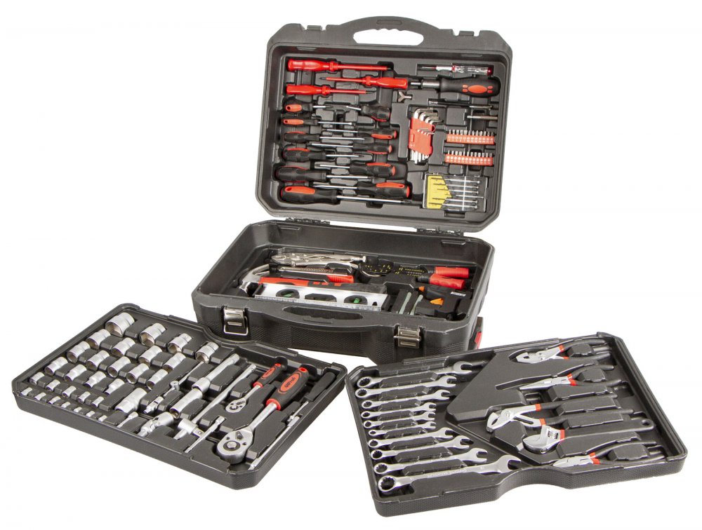 Univerzální sada pro montáže, údržbu a opravy v domácnosti, garáži i dílně. Uživatel má po ruce šroubováky, kleště, gola nástavce 1/2" a 1/4", měřidla i spotřební materiál.