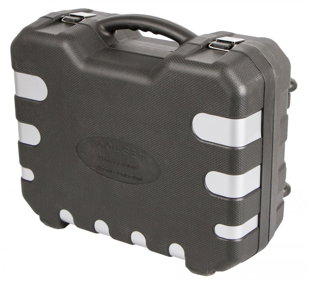 Konstrukci tvoří odolný plastový kufr se 4 výklopnými platy a přesným uložením každého dílu. Pracovní části nástrojů jsou ze slitiny Cr-V v matném provedení, rukojeti z kombinace plastu a gumy pro jistý úchop.
