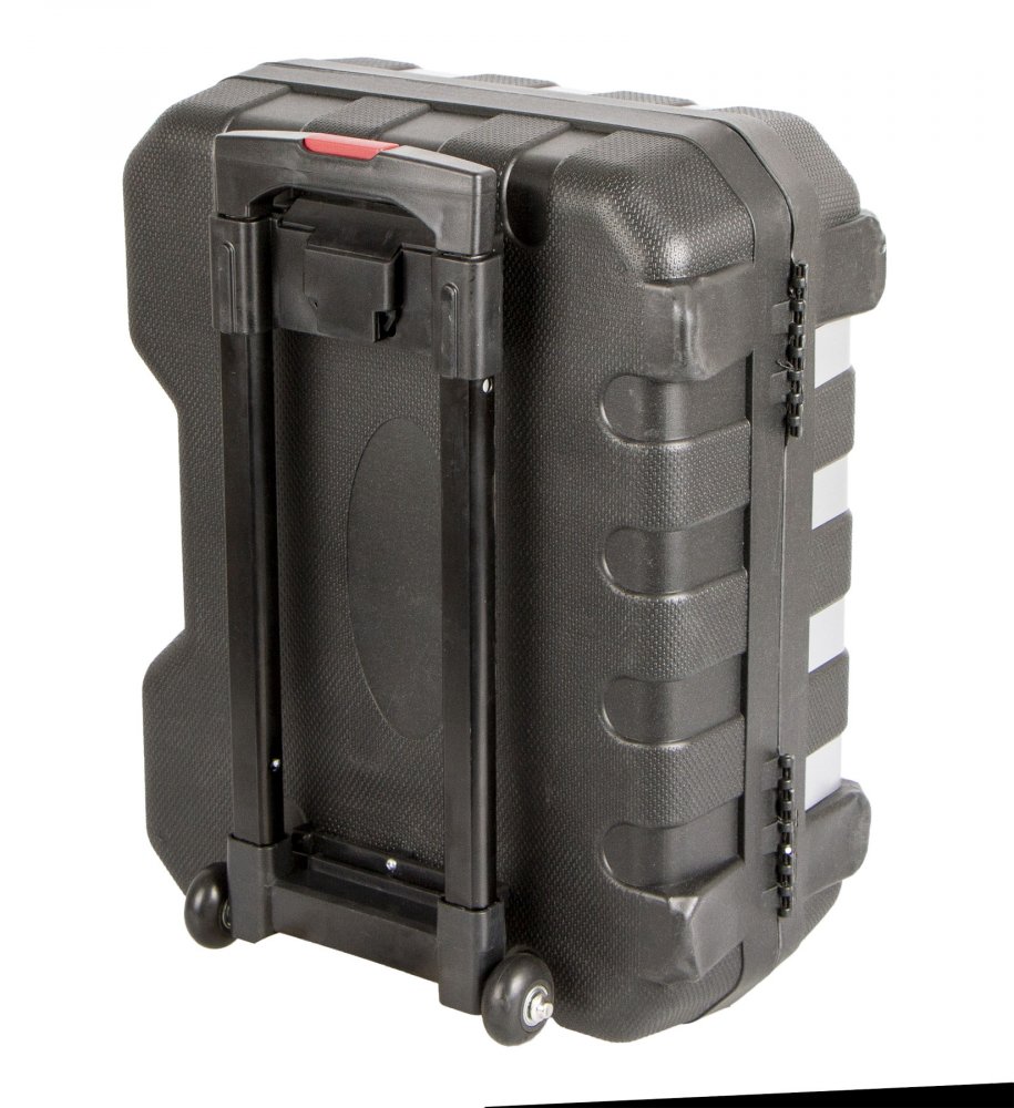 Výbava kufru: teleskopický úchyt, 2 madla, demontovatelná kolečka, kovové přezky