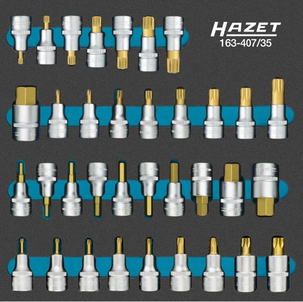 Kvalitní sada nástrčných hlavic 1/2" s bity IMBUS, TORX, XZN a RIBE CV, německý výrobce HAZET, dodáváno v pěnové vložce, ideální do pojízdných vozíků.