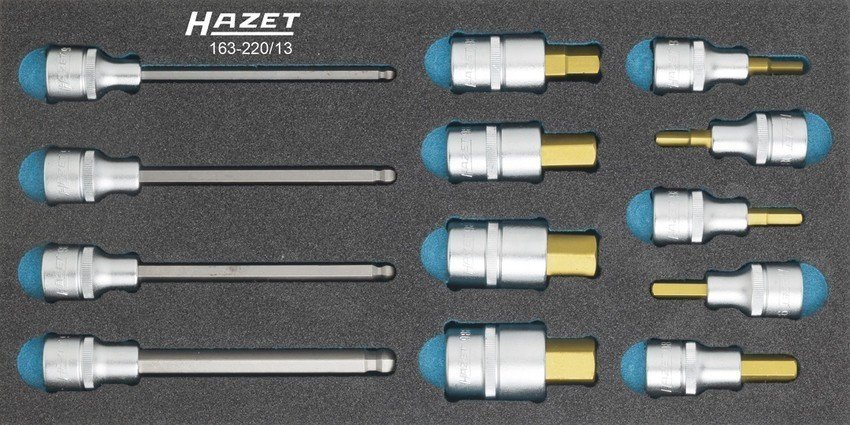 Sada kvalitních nástrčných hlavic s bitem IMBUS od německého výrobce HAZET, 13 kusů v pěnové vložce, rozměr 1/2", velikost bitu 5 až 19 mm, dlouhé a krátké provedení.