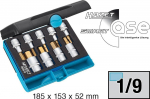 Sada 9 vysoce kvalitních hlavic s bity IMBUS, v plastové krabičce, vnitřní čtyřhran 1/2", bity IMBUS 5 - 17 mm.