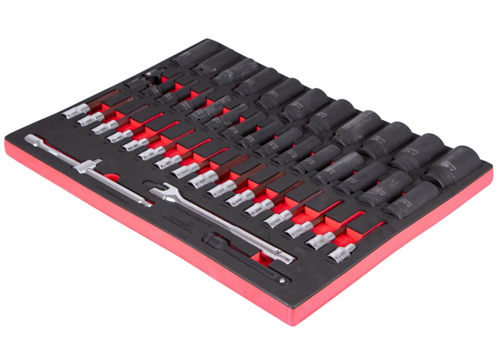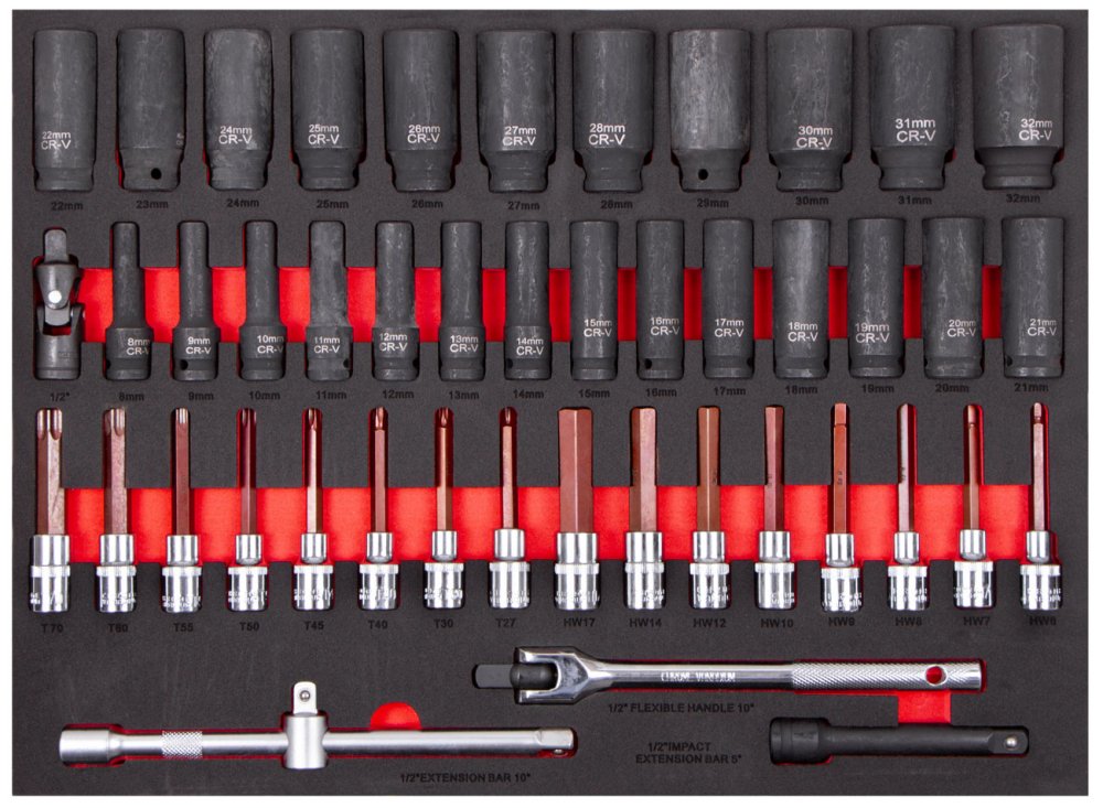 Sada hlubokých rázových hlavic, bitů a příslušenství 1/2" v praktické pěnové výplni, ideální pro náročné montážní a servisní aplikace.
