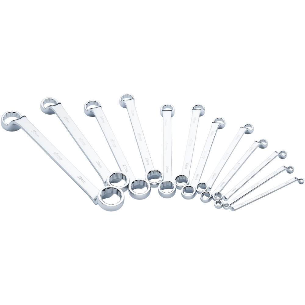 Oboustranné očkové klíče, sada 12 kusů, vyhnuté. Chromovaný, leštěný povrch, 12hranný profil, zalomení 15°, velikosti klíčů 6-32 mm. Norma DIN 838 a ISO 10104.