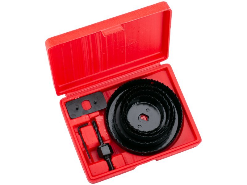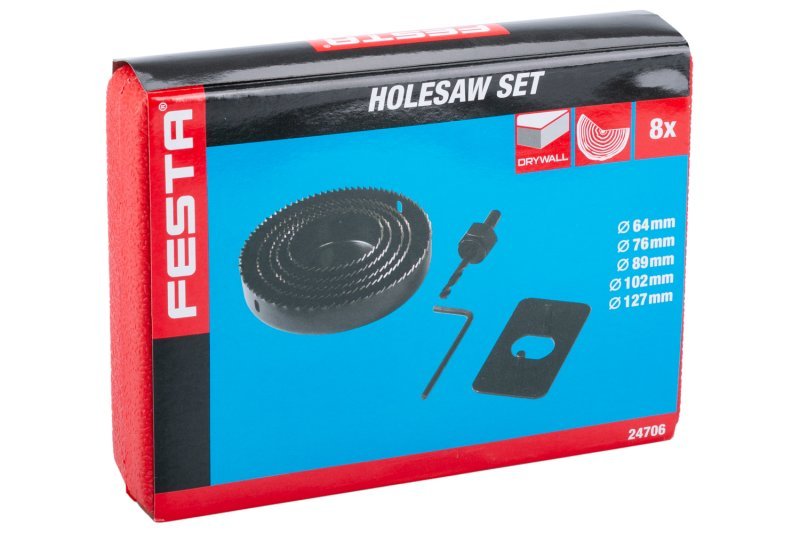Sada vykružovacích pil 8ks do dřeva a sádrokartonu, průměr: 64,76,89,102,127 mm, inbus+hlavička. Instruktážní video