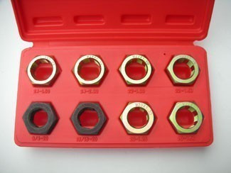 8 dílný set pro opravu poškozených závitů hřídelí kol automobilu z kvalitního materiálu.