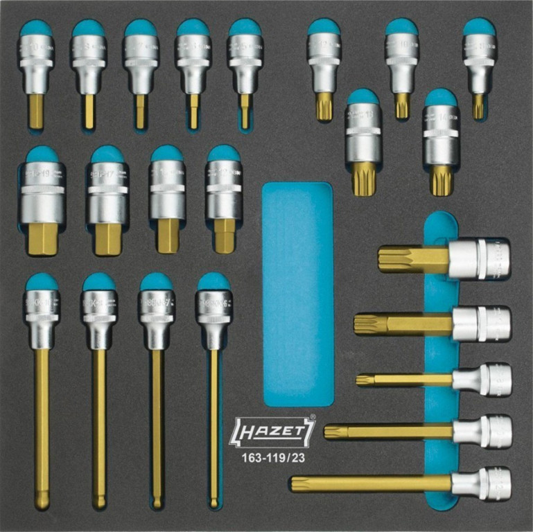 Sada šroubovákových hlavic 1/2" od německého výrobce HAZET, 23 dílů, obsahuje hlavice s bity IMBUS a XZN tisícihran.