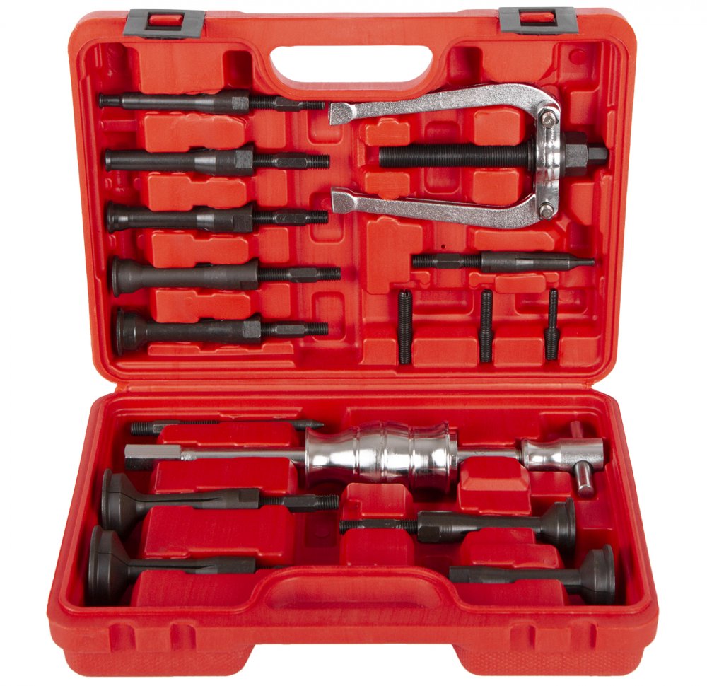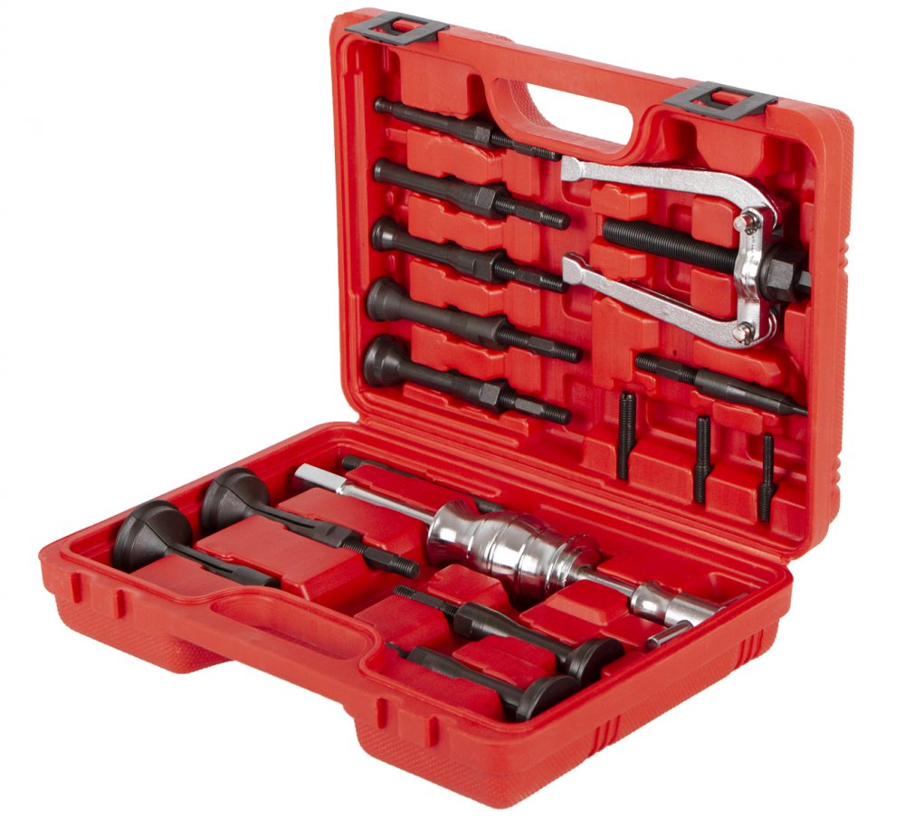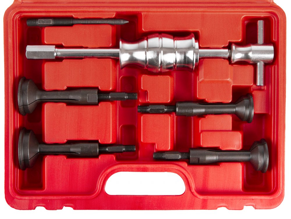 Mimo samotných stahováků je sada také vybavena reverzním kladivem a třemi adaptéry M10 x 1,5, M10 x 1,5; M8 x 1,5, M10 x 1,5; M6 x 1.