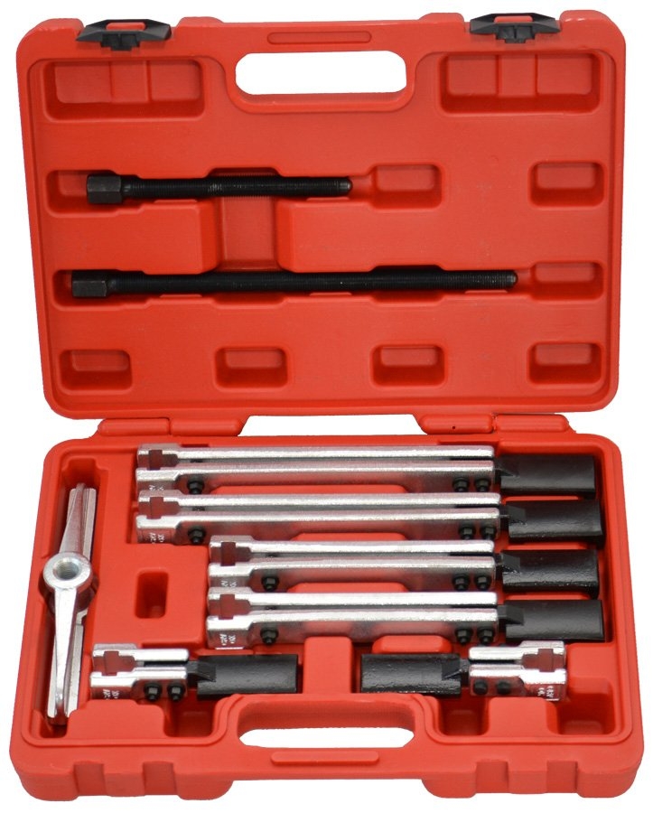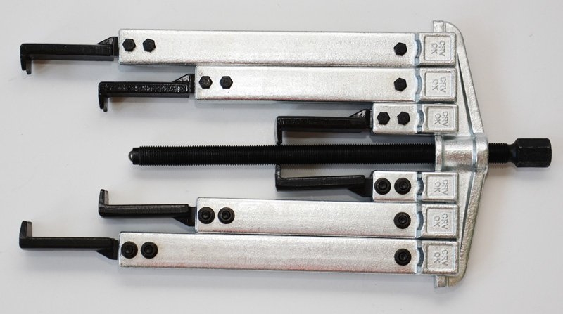Sada univerzálních dvouramenných stahováků v plastovém kufříku umožňuje sestavit 3 stahováky různých velikostí.
