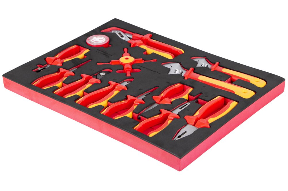 Univerzální sada izolovaného VDE nářadí pro práci s vodiči a elektrickými rozvody, uložená v praktické pěnové výplni do zásuvky dílenského vozíku.