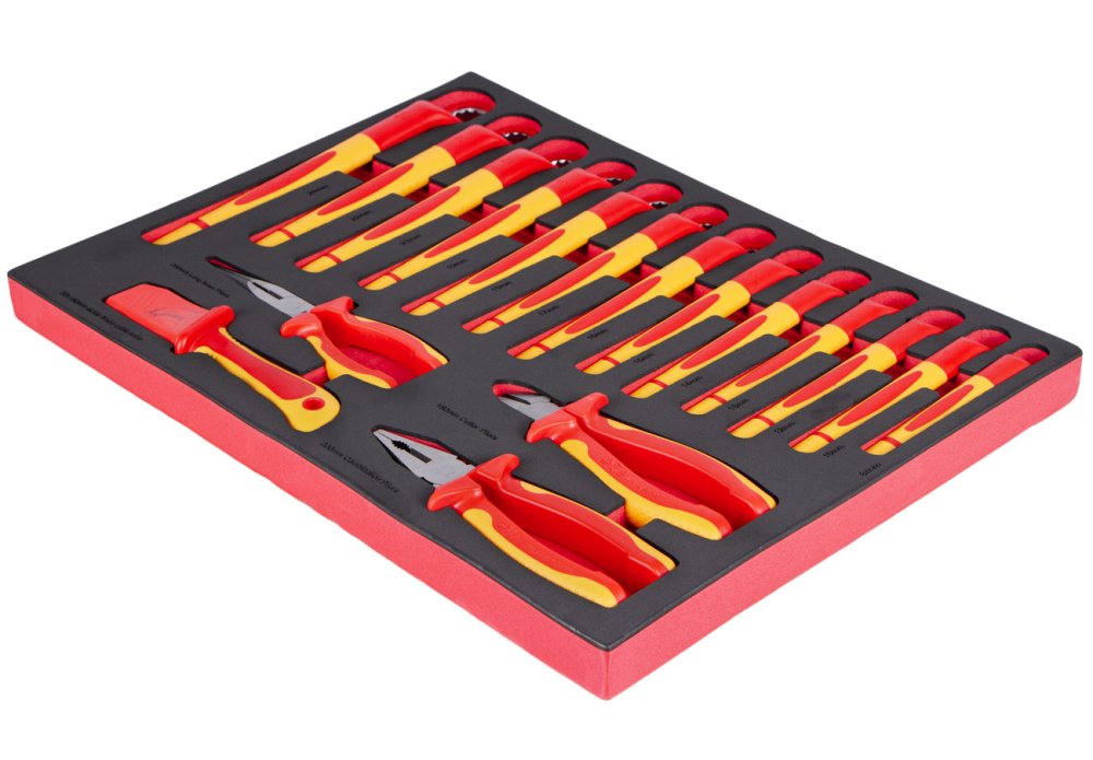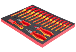 Kompletní VDE sada očkových klíčů a kleští pro práci pod napětím, uložená v tvarované pěnové výplni do dílenského vozíku.
