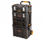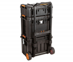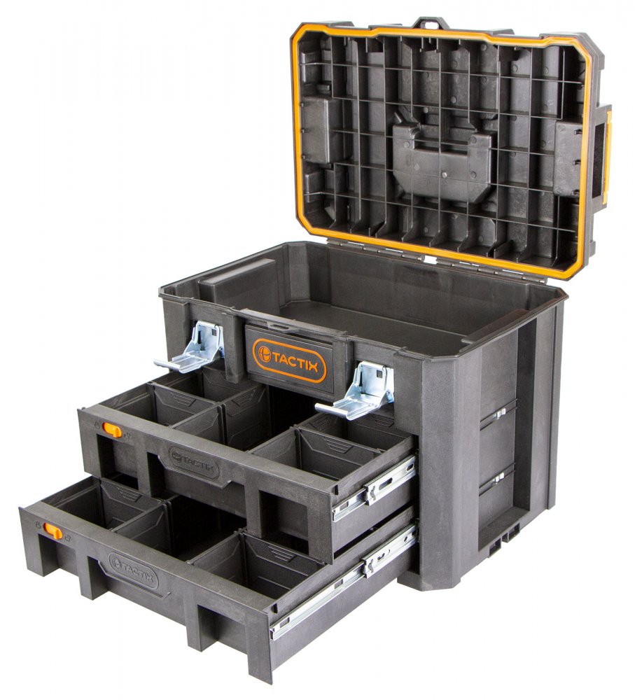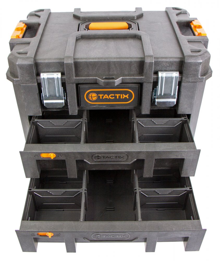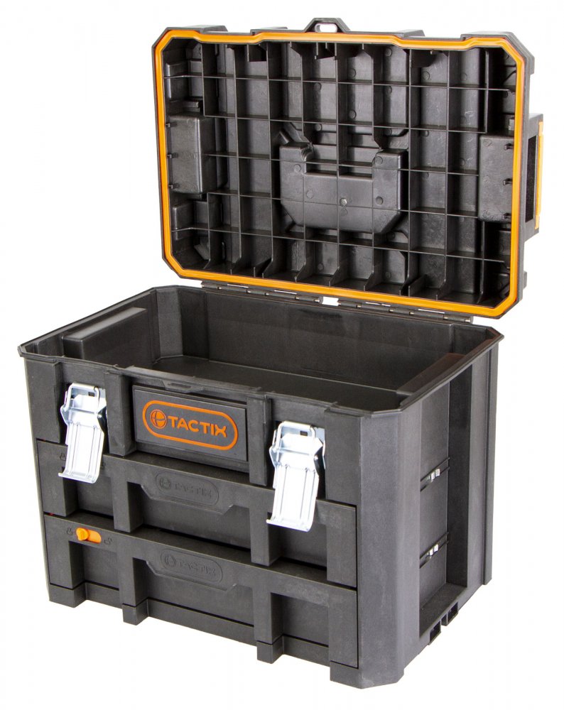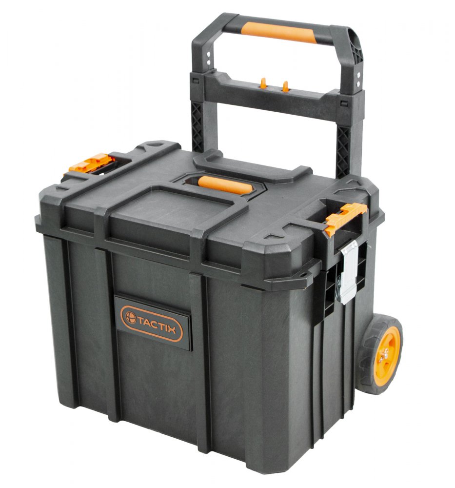 Hlavní výhodou kufrů od značky Tactix je jejich variabilita úložných prostorů, vodotěsnost a snadná manipulace celé sady díky madlu a kolečkům.