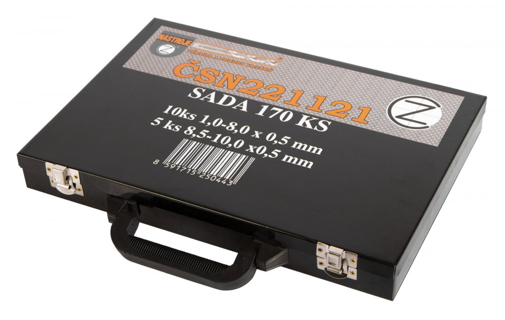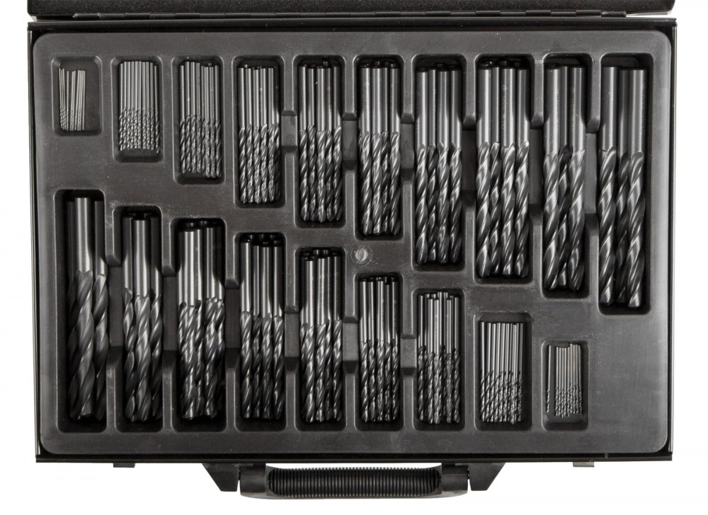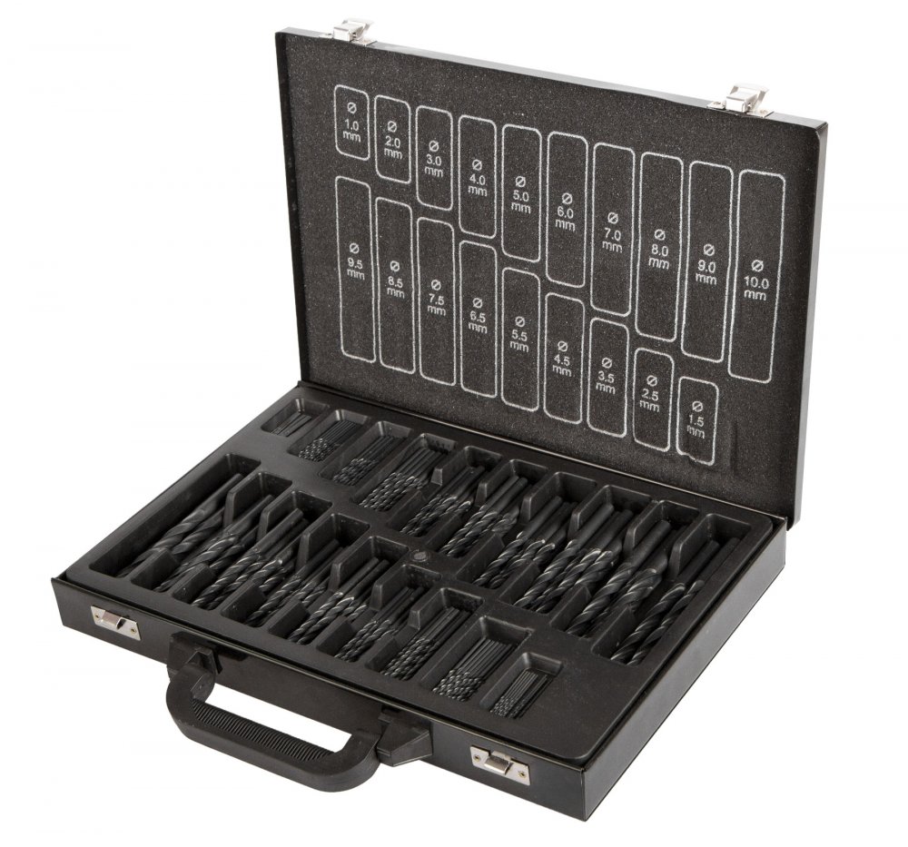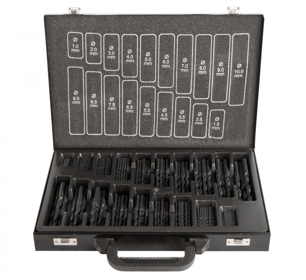 Kvalitní standardní vrtáky v sadě 170 ks odstupňovaných po 0,5 mm uložené v kovovém boxu.