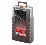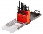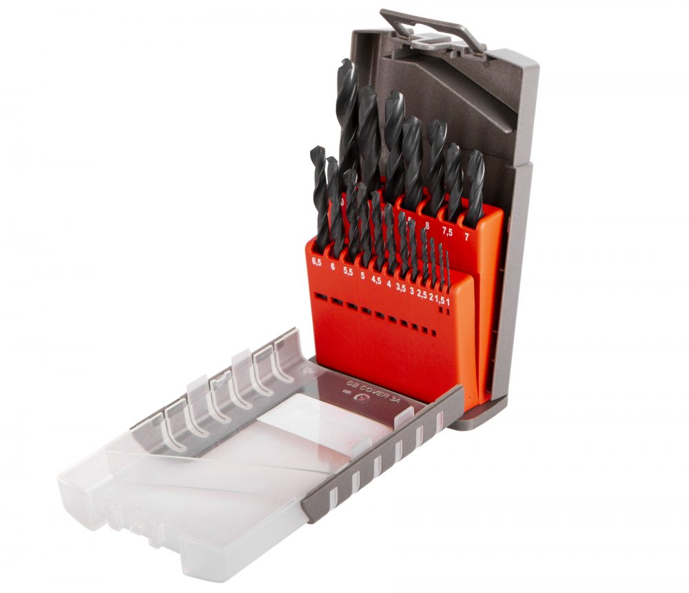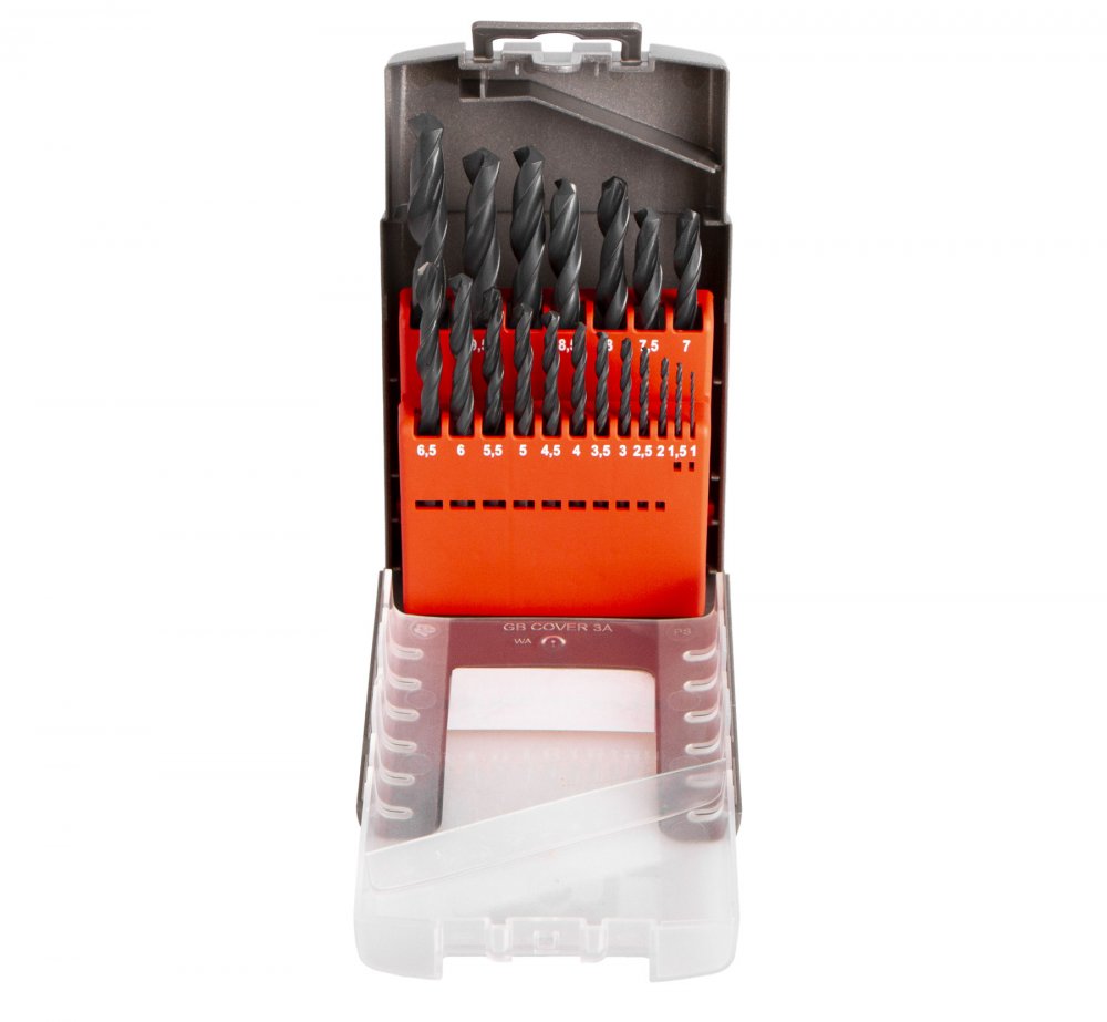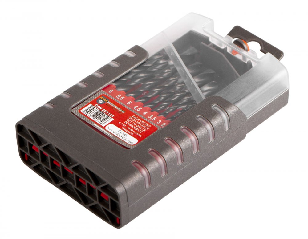 Kvalitní standardní vrtáky v sadě 19 ks odstupňovaných po 0,5 mm uložené v plastovém boxu.