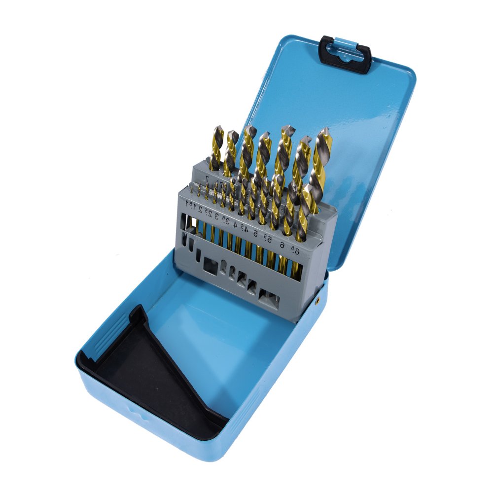 Sada vrtáků do kovu vyrobených z HSS oceli. Vrtáky jsou uloženy v kovovém boxu. Lze opětovně brousit. Celý popis