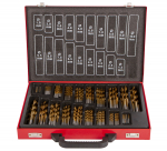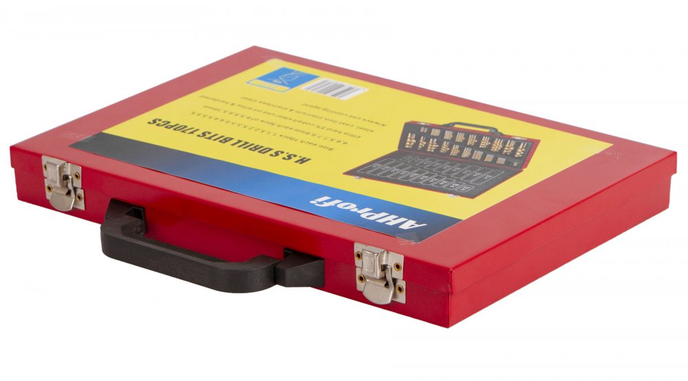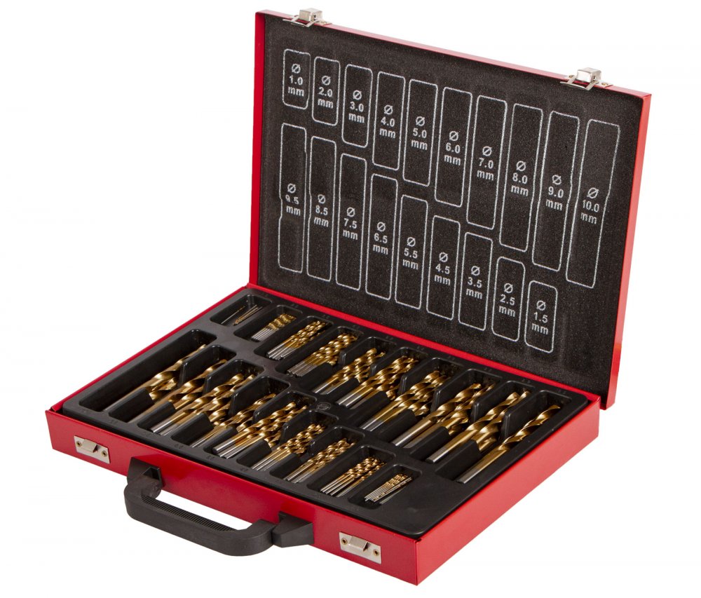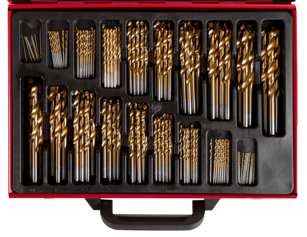 - Sada 170 vrtáků s titanovou povrchovou úpravou (dle normy DIN 338) a válcovou stopkou.