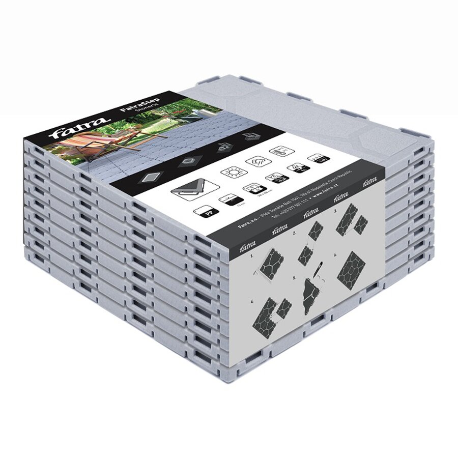 Plastové dlaždice FATRASTEP Slateris jsou určeny pro terasy, balkóny nebo okolo bazénů. Napodobují dezén kamene. Dlaždice je velmi snadné a rychlé poskládat i demontovat. Díky postranním háčkům je možné dlaždice navzájem spojovat. Dlaždice jsou vyrobeny z polypropylenu, odolávají tedy olejům a rozpouštědlům. Jednotlivé díly do sebe stačí jen zacvaknout a je hotovo. Pokládka Vám v menších prostorech nezabere více než pár desítek minut. Balení obsahuje 9 dlaždic (0,81m²).