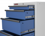 Zásuvky dílenského nábytku PROFI mají vysoce kvalitní pojezdy s kuličkovými ložisky, které poskytují plynulost a přesnost pojezdu zásuvek i při plném zatížení. Max. nosnost zásuvky činí 30 kg.