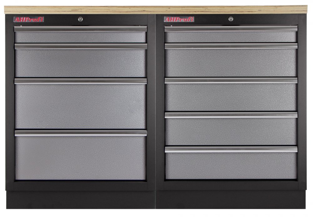 Dílenský nábytek PROFI GREY s dřevěnou deskou zaujme moderním a profesionálním vzhledem. Kombinace kladívkové šedé a černé RAL 9004 se bude vyjímat v každé garáži i dílně.