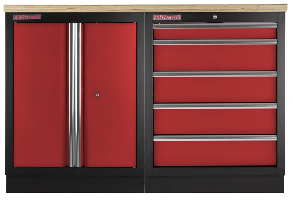 Dílenský nábytek PROFI RED s dřevěnou deskou zaujme moderním a profesionálním vzhledem. Kombinace červené RAL 3031 a černé RAL 9004 se bude vyjímat v každé garáži i dílně.
