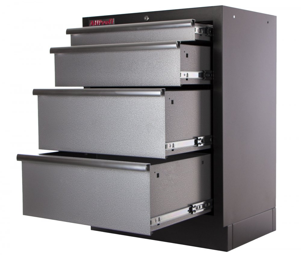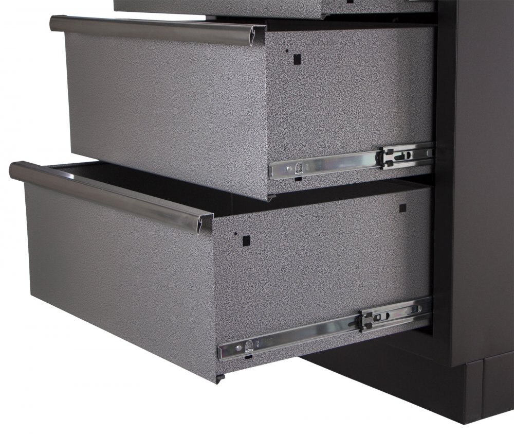 Zásuvky dílenského nábytku PROFI mají vysoce kvalitní pojezdy s kuličkovými ložisky, které poskytují plynulost a přesnost pojezdu zásuvek i při plném zatížení. Max. nosnost zásuvky činí 30 kg.