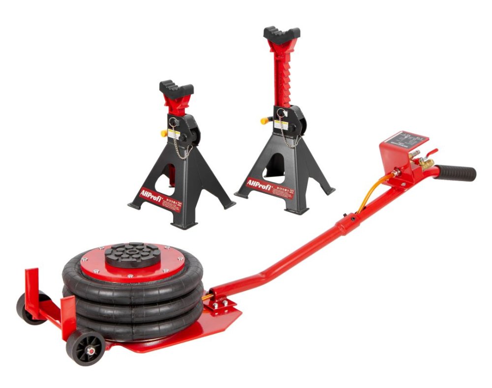 Kompletní sada pro rychlé zvedání a bezpečné podepření vozidel. Obsahuje pneumatický měchový zvedák s nosností 3 t a pár výškově stavitelných podpěr s nosností 3 t.
