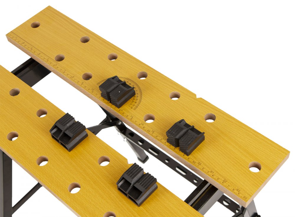 V horní desce se nachází 24 otvorů, do kterých lze libovolně umístit plastové kolíky. Díky kolíkům lze nastavit šířku pro upnutí různých latí, prken a dalších materiálů pro řezání a jinou úpravu.