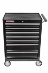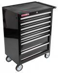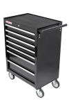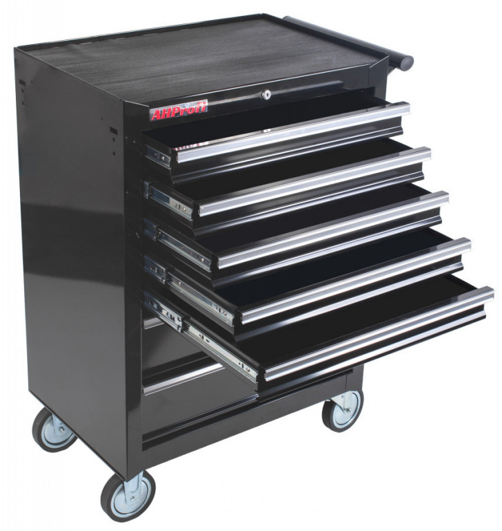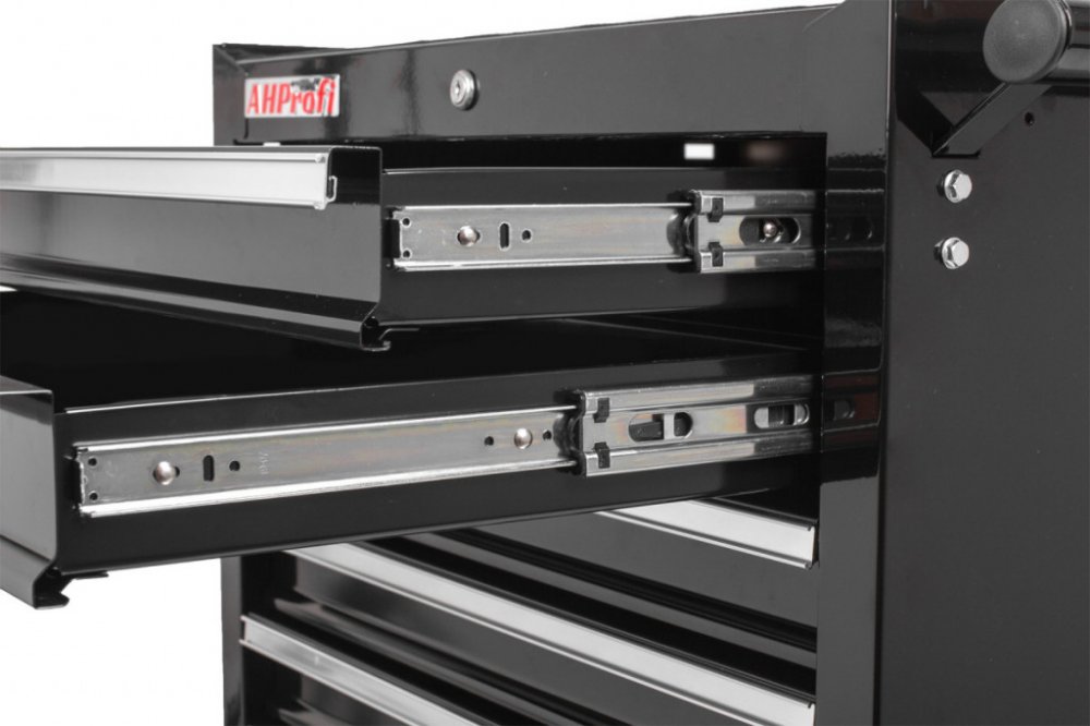 Pojízdná skříňka v přepychovém černém provedení se 7 zásuvkami, které jsou samozřejmě opatřeny kuličkovými pojezdy a zajištěny proti neúmyslnému vysunutí, se stane hvězdou jakékoli dílny.