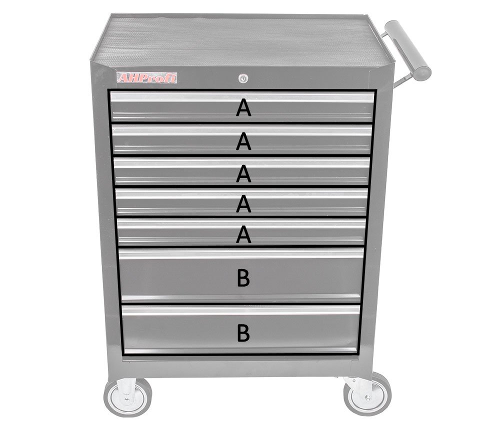 Vrchní deska je dostatečně prostorná (67 x 45 cm) a ze tří stran vymezená lemem pro odložení dílů nebo aktuálně používaného nářadí. Protiskluzová část k ní není záměrně připevněna, aby si uživatel mohl horní desku osadit jakýmkoli jiný materiálem, který mu při montážích vyhovuje a skříňku si tak upravil dle svých individuálních potřeb. Kompletní rozměry dílenského vozíku naleznete v záložce Podrobnější informace.