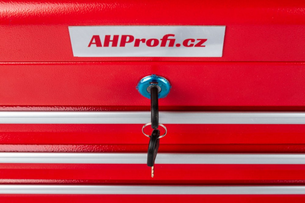 Skřínka má pojezdy s kuličkovými ložisky, které zajišťují snadný výsuv i při plně zatíženém šuplíku. Horní výklop je možný uzamknout.