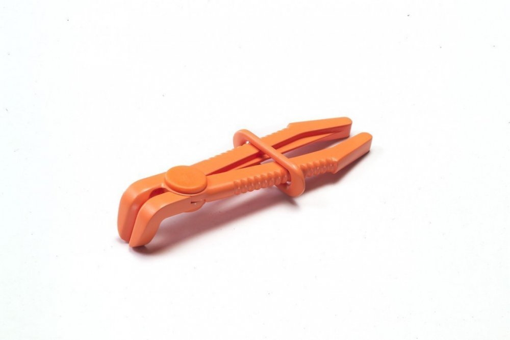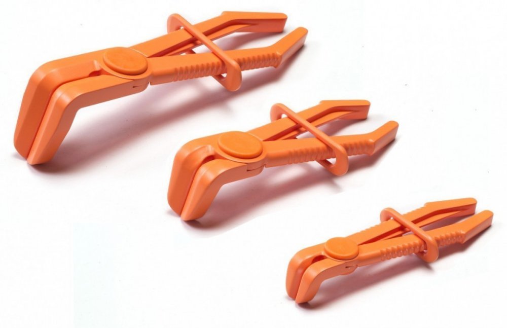 V sadě naleznete 3 speciální kleště se zahnutými čelistmi k sevření hadic. Zahnuté čelisti minimalizují nechtěné sražení kleští z uzavřené hadice. Svorka je díky tomu prakticky rovnoběžně s uzavřenou hadicí, a tak se při práci v místech uzavření hadice nemusíte bát, že by byla svorka z hadice sražena a obsah hadice (nádrže) vytekl. Svorky jsou výrazně zbarveny, aby byly dobře viditelné se zabránilo jejich ztrátám.