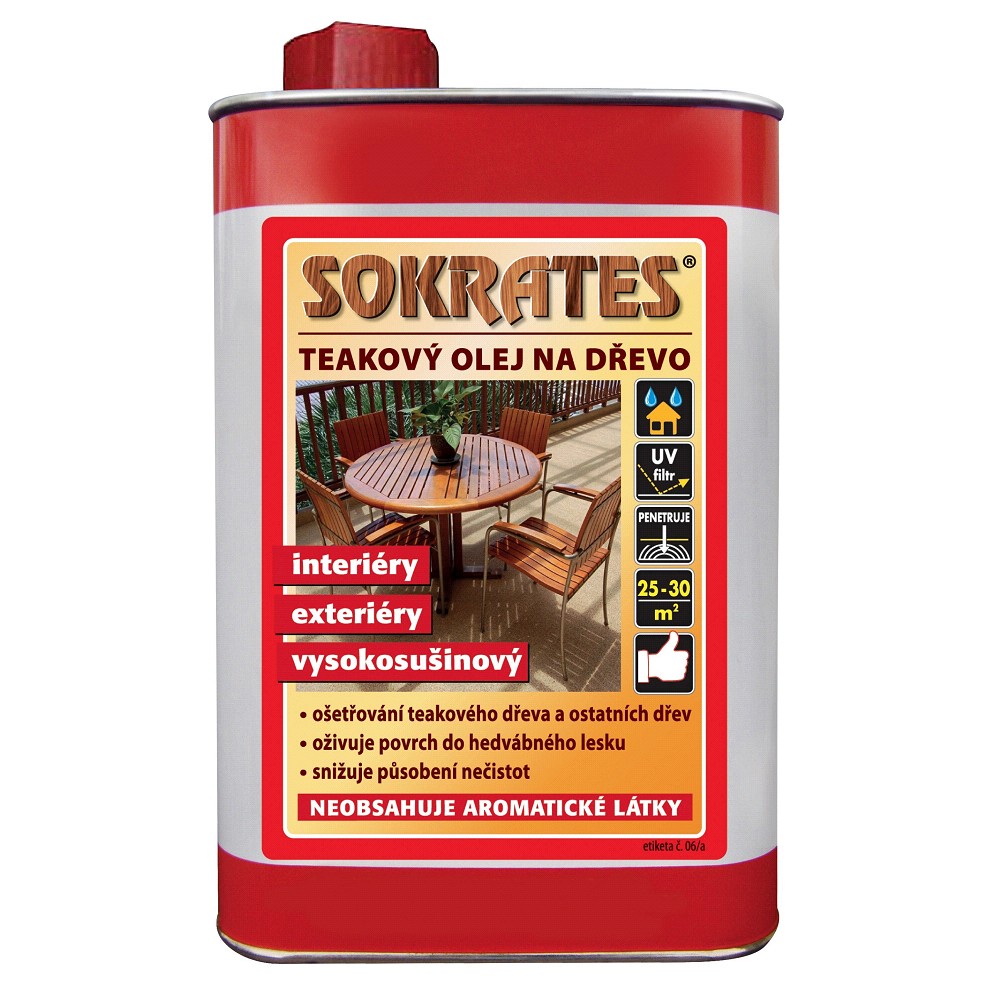 Vynikající prostředek k čistění a ošetřování zahradního nábytku a jiných výrobků z teakového dřeva, akátu, meranti nebo podobných dřev. Teakový olej Sokrates pochází od holandského výrobce přírodních napouštěcích olejů.