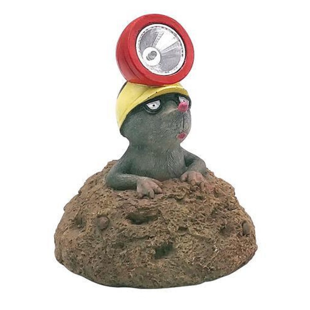 Dekorační figurka krtka s přilbou a světlem na solární světlo.