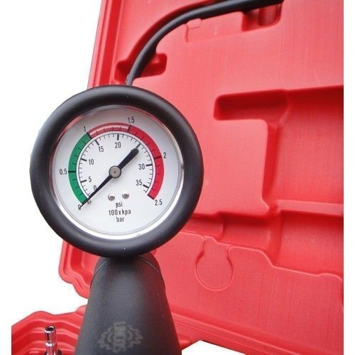 Po výběru vhodného adaptérů a jeho zašroubování ke chladící soustavě připojíme pumpičku a natlakujeme na 10 - 15 psi nebo podle specifikace výrobce vozu a sledujeme zda tlak neklesá.