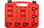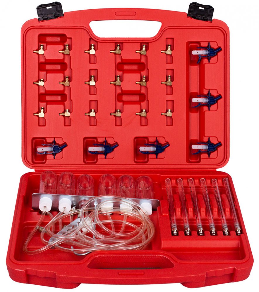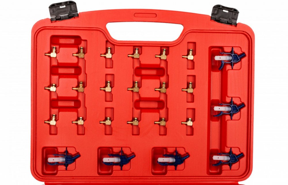 - Plastový kufřík obsahuje odměrné válce a nádoby a sortiment adaptérů pro připojení k systému Bosch, Delphi a Denso pro všechny běžně dostupné vozy.