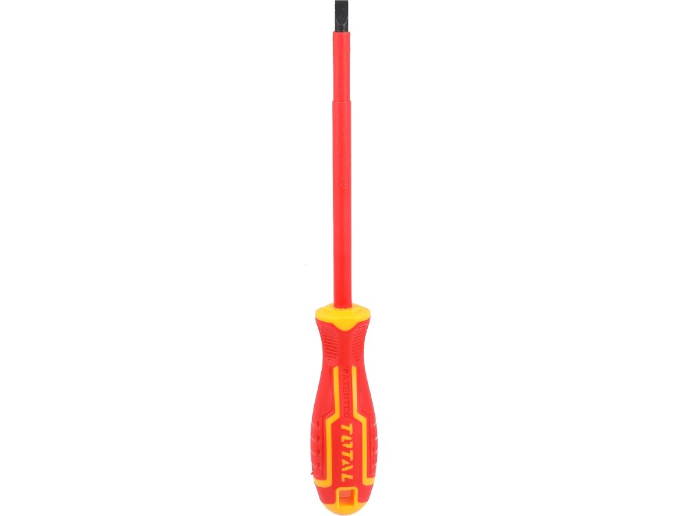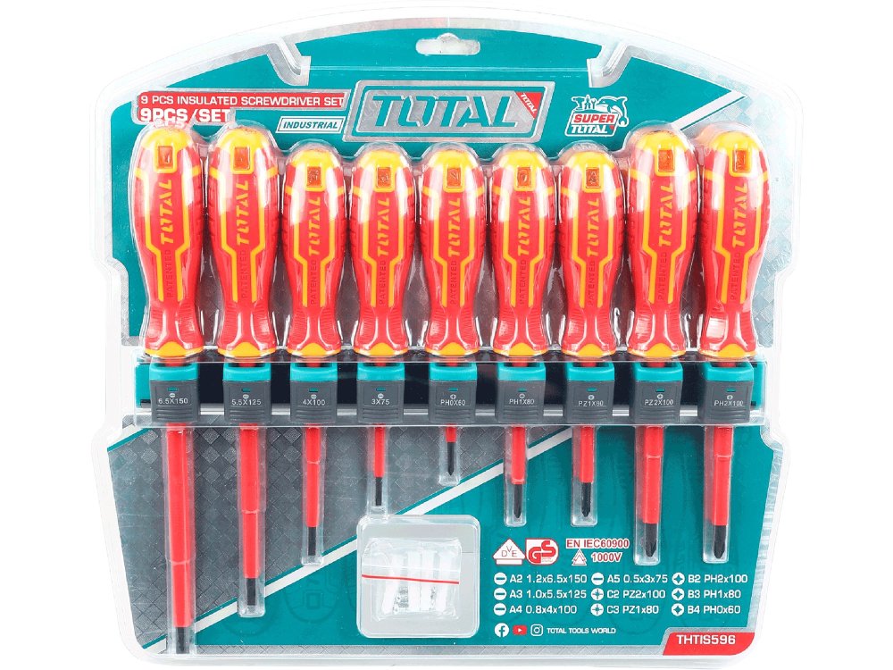 Sada elektrikářských šroubováků upevnitelná na zeď. Dodáváno s hmoždinkami a šroubky pro připevnění na zeď.Šroubováky mají výrazný červený design typický pro všechna elektrikářská nářadí firmy Total tools. Provedení šrobováků je v industriální kvalitě. Jsou tedy vhodné jak pro řemeslníky, tak pro firmy. Šroubováky jsou magnetické. Sada obsahuje tyto šroubováky 9ks: SL3.0x75, SL4.0x100, SL5.5x125, SL6.5x150, PH0x60, PH1x80, PH2x100, PZ1x80, PZ2x100, Šroubováky v sadě mají nový design rukojetí. Jsou certifikovány 1000V,VDE+GS Certifikací.