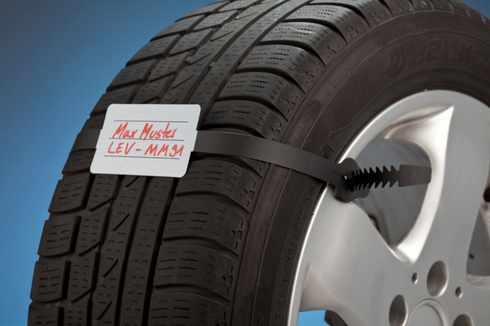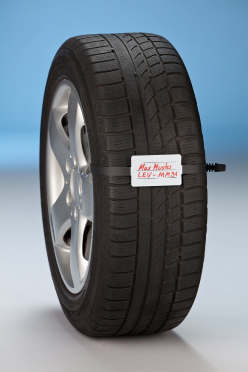 - Plastová visačka s identifikačním štítkem na kola a se zdrhovací páskou pro označování kompletních kol při jejich skladování.